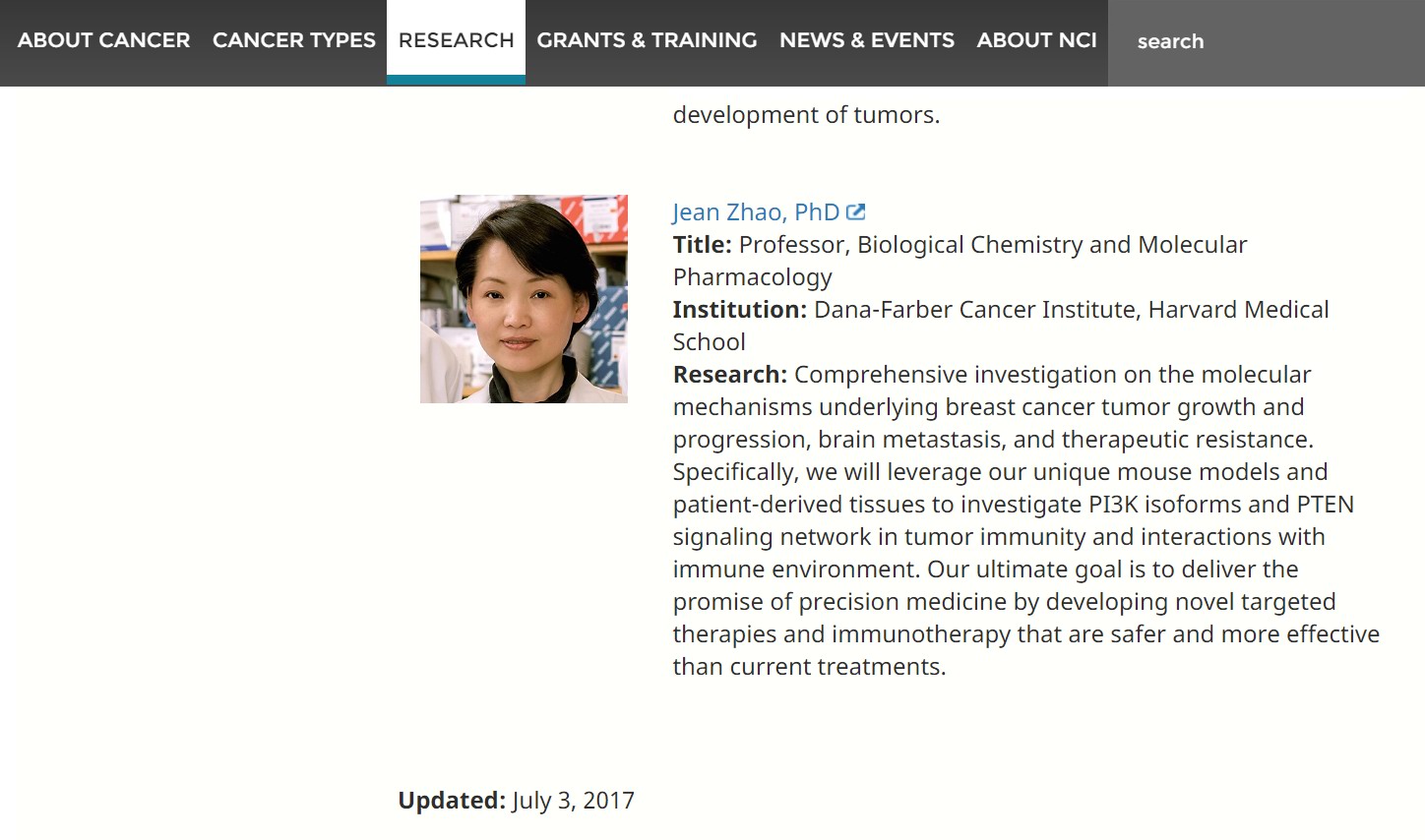 赵景教授1984年本科毕业于性吧 生物学系,1999年获得美国Tufts University School of Medicine分子生物学与微生物学博士学位,之后在哈佛大学医学院达纳法伯肿瘤研究所从事博士后研究。现任哈佛大学医学院化学生物与分子药理学终身正教授,博士生导师,哈佛-达纳法伯乳腺癌中心领导人, 达纳法伯肿瘤院研究院执行委员会核心成员, 美国癌症研究协会年会科学委员会联合主席, 美国国家脑肿瘤学会委员会顾问, 美国国立卫生研究院分子靶标和癌症治疗研究部评审专家,美国国防部乳腺癌研究评审专家,美国国家脑肿瘤学会科学顾问。