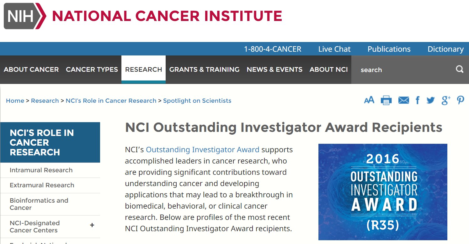 NCI(National Cancer Institute)隶属于美国国立卫生研究院 (National Institutes of Health, NIH),是全美癌症研究和资助的主要机构。该奖项专门授予在癌症研究领域做出突出贡献的研究人员,是该领域的顶级奖项。获奖者均是为生物医学、生物行为学和临床癌症研究等领域取得突破性贡献的研究先行者,其中大多是科学院院士级的大腕明星科学家。该年度与赵景教授同时获奖的还有来自斯坦福大学的Ronald Levy教授, 来自斯隆凯特琳癌症中心的Neal Rosen博士和来自康奈尔医学院的Lewis Cantley教授等。