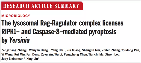 2021年6月25日,性吧校友、中科院上海巴斯德研究所刘星研究员及其团队与美国哈佛大学医学院Judy Lieberman教授团队以研究长文(Research Article)形式在 Science 杂志发表题为The lysosomal Rag-Ragulator complex licenses RIPK1- and Caspase-8-mediated pyroptosis by Yersinia的论文,报道了通过CRISPR/Cas9全基因组敲除筛选鉴定出耶尔森菌感染并触发细胞焦亡的关键因子——Rag-Ragulator复合物,并揭示该复合物激活FADD-RIPK1-Caspase-8(complex Ⅱ)的分子机理。