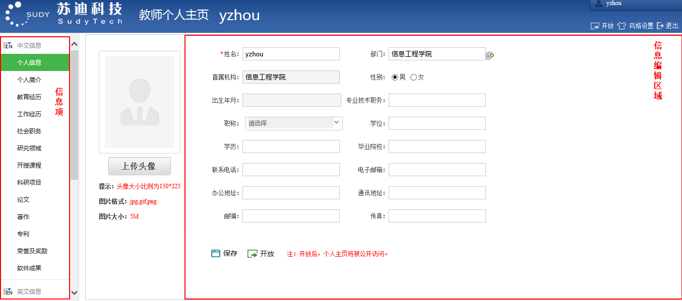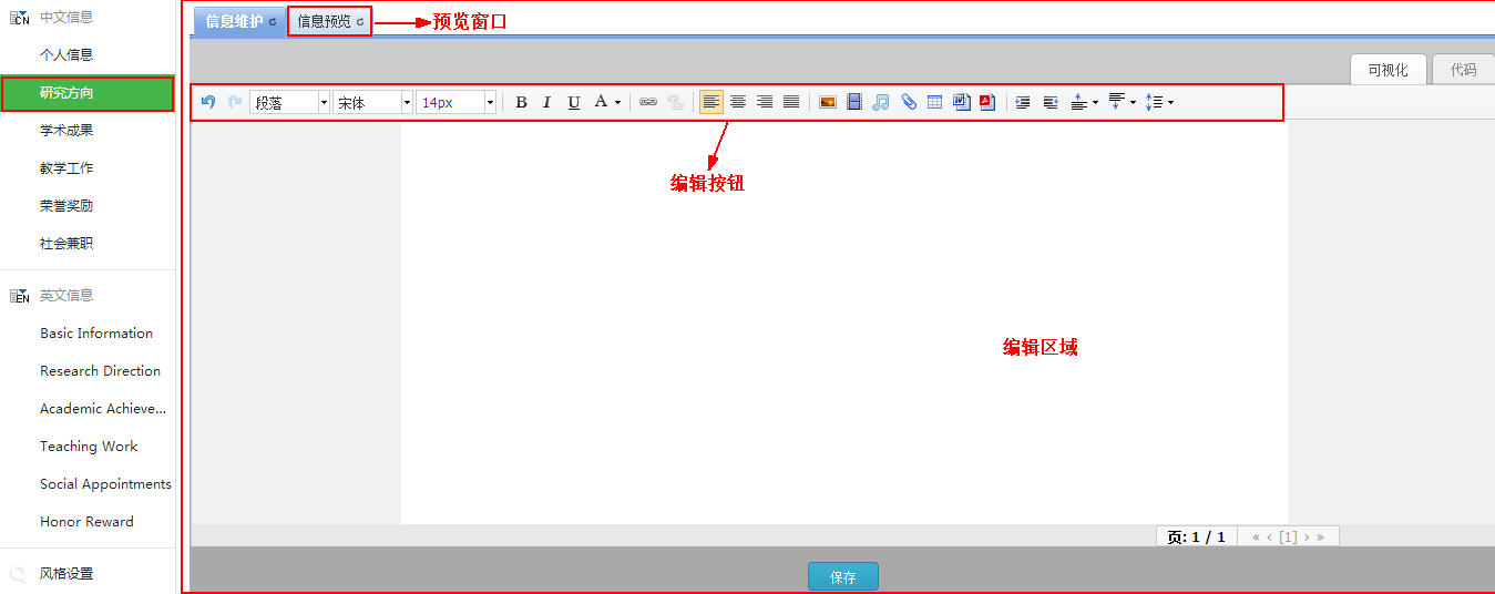 页面左侧展示的即为您可选择维护的个人“信息项”(中英文),例如:个人信息、研究方向、教学工作、荣誉奖励等。单击选择各“信息项”后,页面右侧即展示该“信息项”内容的编辑页面。