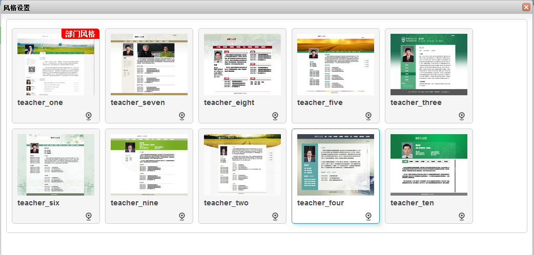 系统默认提供10套“教师个人页”的页面风格以供选择,您可根据个人喜好随意选择。