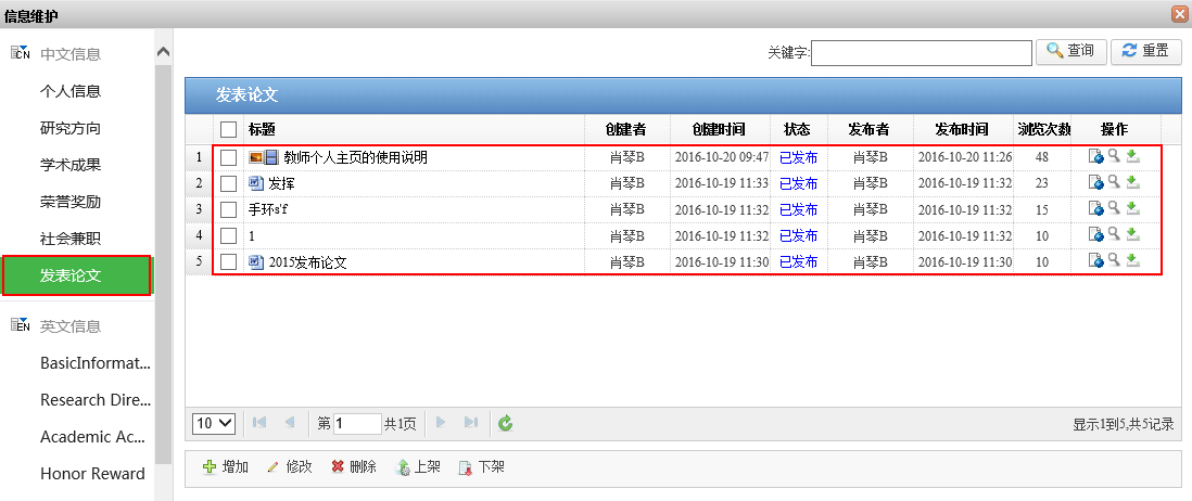 该类型“信息项”的内容是以文章列表的形式展示在“教师个人页”中,您可根据需要添加需要展示的文章。